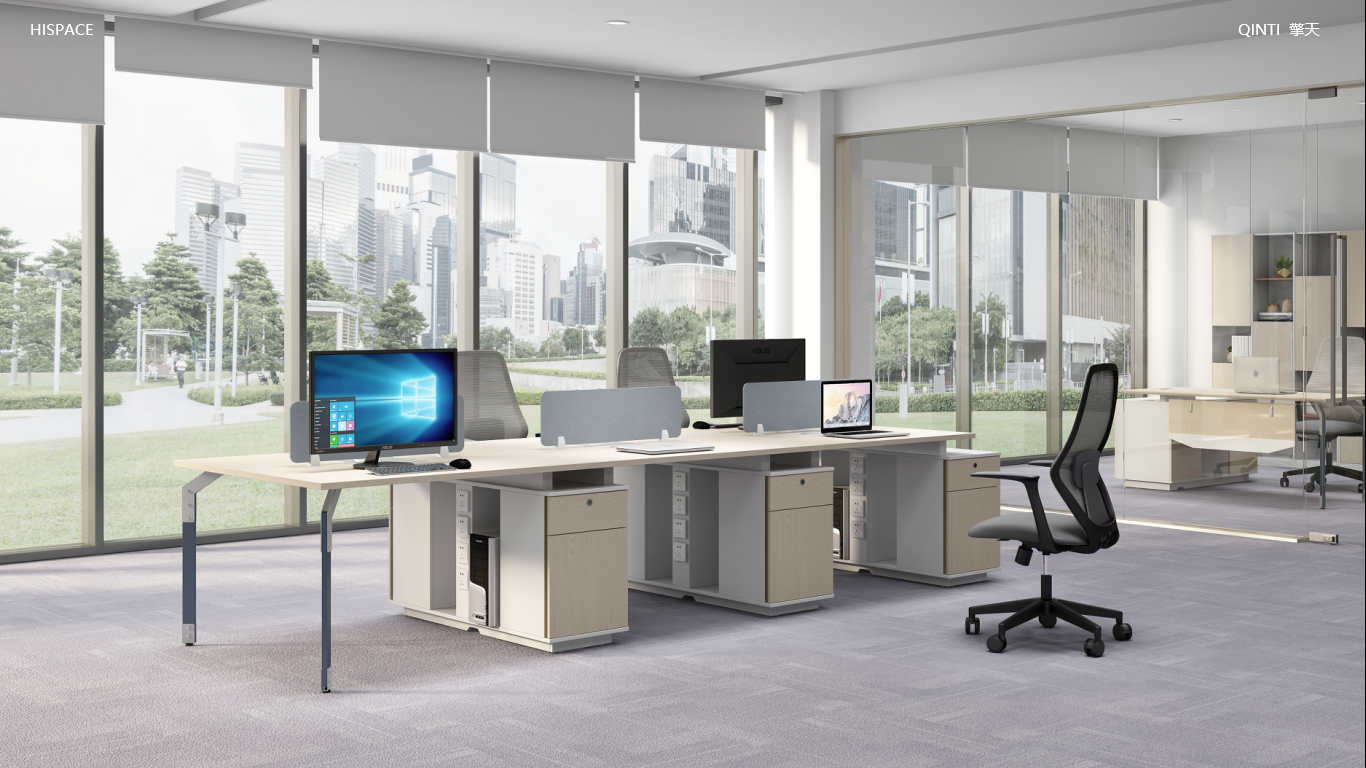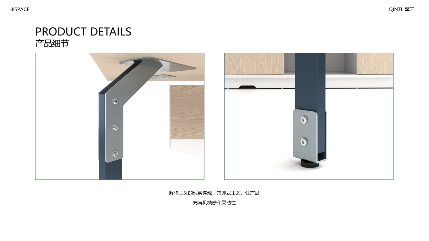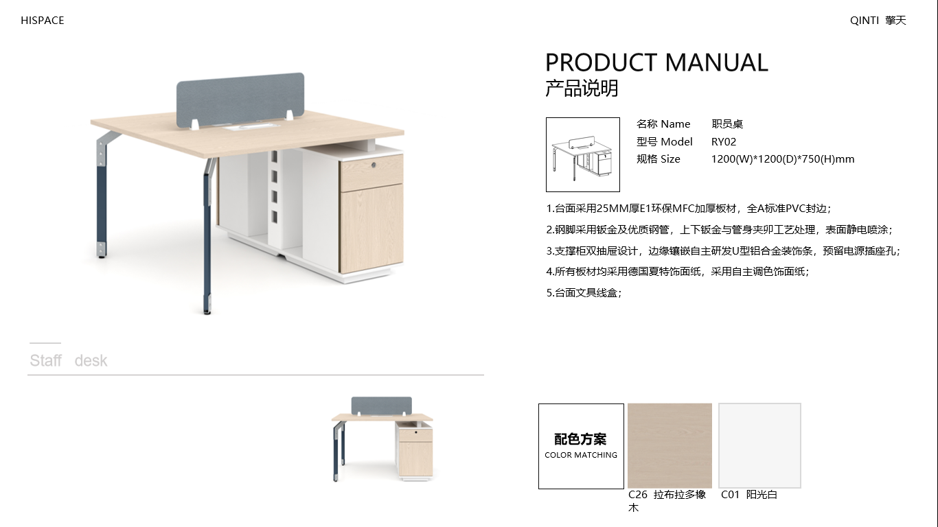 • 臺面采用25MM厚E1環保MFC加厚板材,全A標準PVC封邊;鋼腳采用鈑金及優質鋼管,上下鈑金與管身夾卯工藝處理,表面靜電噴涂;支撐柜雙抽屜設計,邊緣鑲嵌自主研發U型鋁合金裝飾條,預留電源插座孔;所有板材均采用德國夏特飾面紙,采用自主調色飾面紙;臺面文具線盒