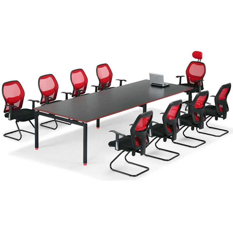臺(tái)面:方形,OF-T031黑色浮雕MFC,黑紅黑雙色PVC直封邊,臺(tái)面分兩塊制作,每臺(tái)中間開一個(gè)常規(guī)線孔。鋼架:(鋼腳,橫梁)噴涂純黑色,鋼腳配紅色可調(diào)腳及頂蓋。 配置:臺(tái)面分兩段做,配3個(gè)鋼腳,不含蛇形管
